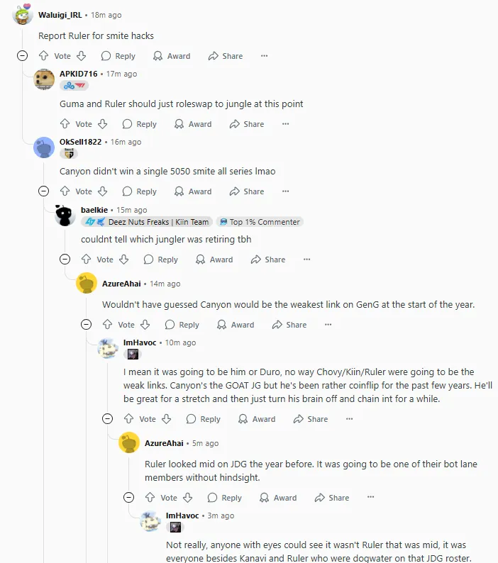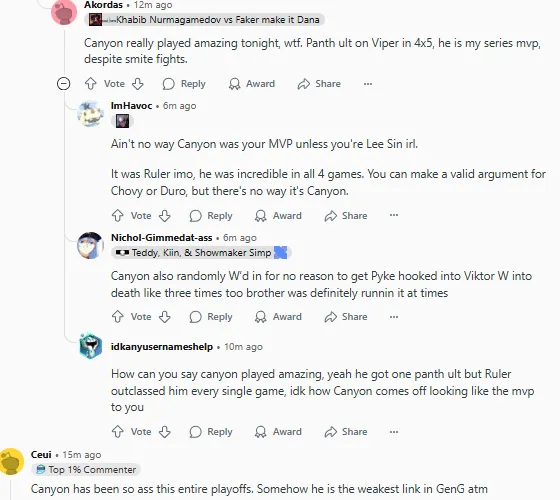我的意思是,要么是他,要么是Duro,Chovy/Kiin/Ruler绝对不可能是最弱的。Canyon是GOAT级别的打野,但他过去几年一直很看状态。他会有一段时间表现出色,然后突然掉线,连续送人头。