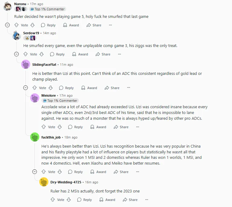 我记得很多最伟大的ADC都认为Uzi也是GOAT,包括Ruler。我记得他说过类似“即使你没有任何失误,也可能会输给他,因为他打得太完美了”。