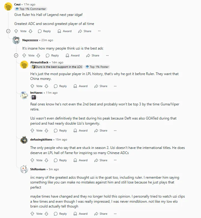 就荣誉而言,很多ADC已经超越了Uzi。Uzi被认为很厉害,是因为其他所有的ADC,甚至是当时排名第二/第三的ADC,都说和他对线是不可能的。他太强了,以至于总是被其他职业ADC吹捧/畏惧。