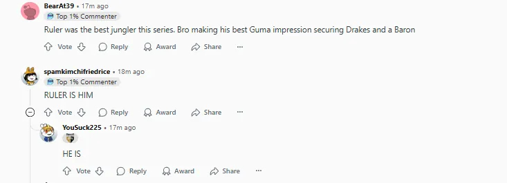 Ruler是这个系列赛里最强的打野,他简直是Guma附体,把龙都控下来了。